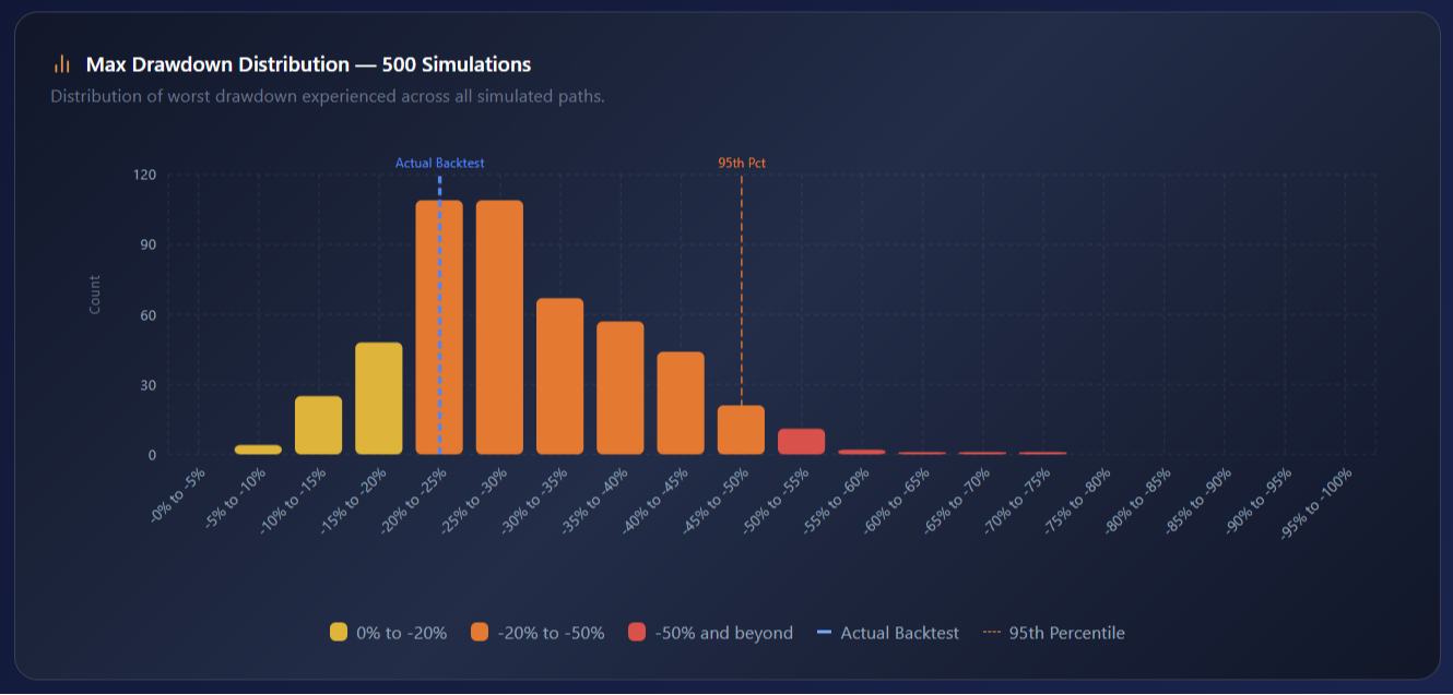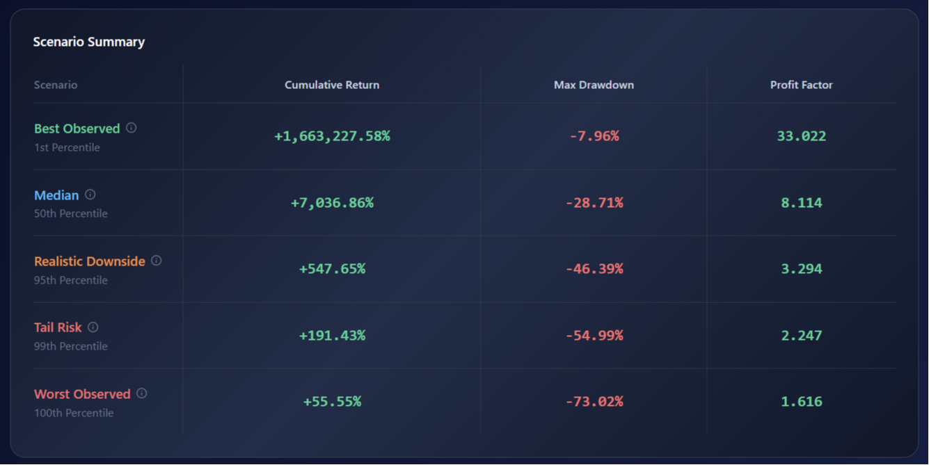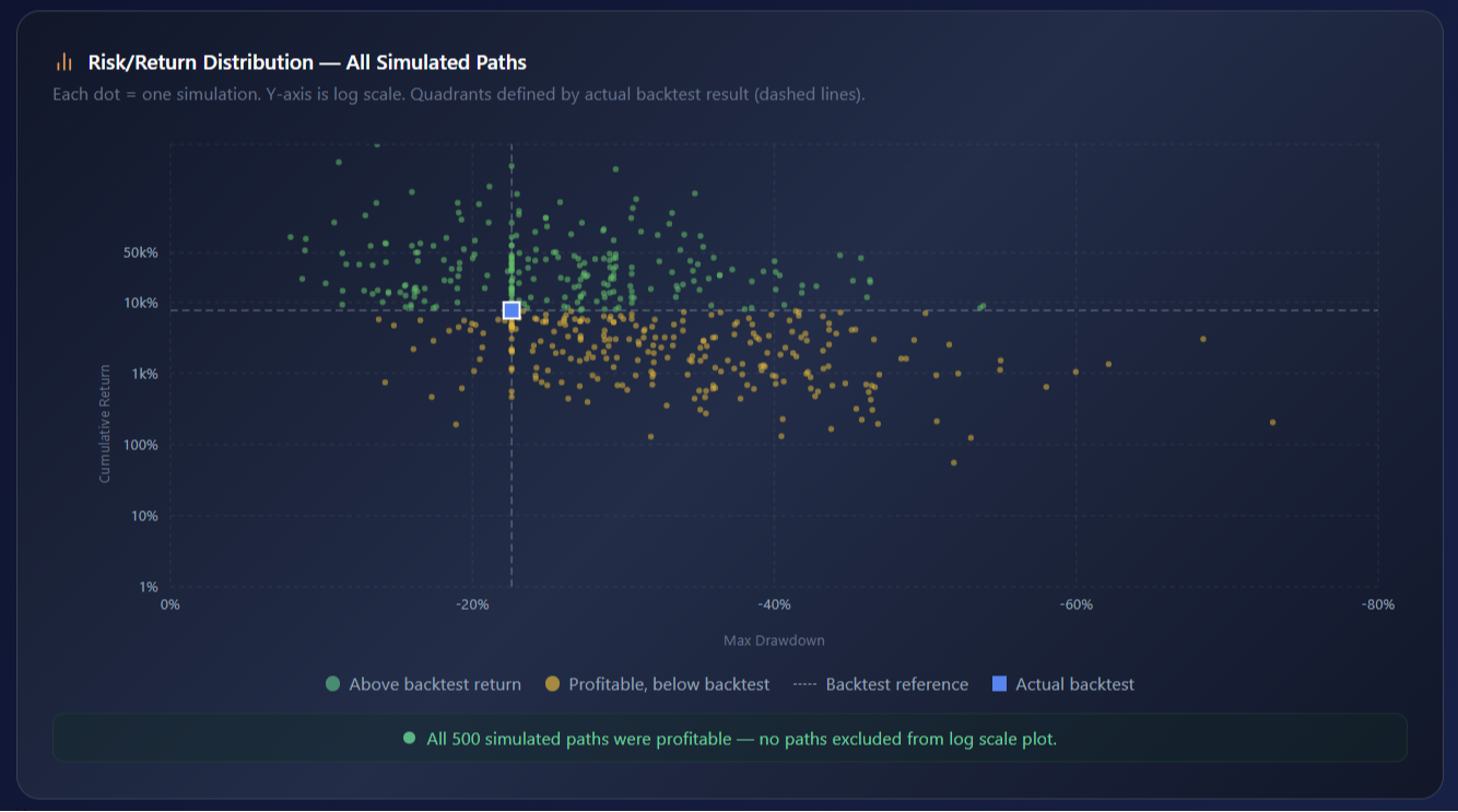 1000+ simulated paths. Scenario summary from best observed to tail risk. Risk/return scatter across all paths. Max drawdown distribution histogram.