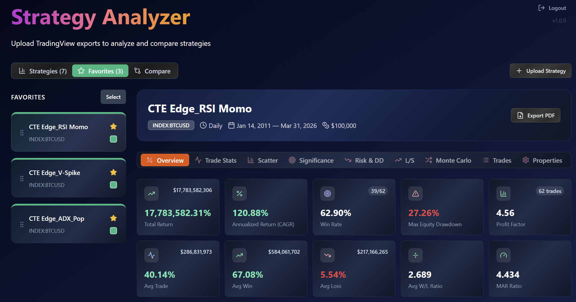 TradingView's built-in report tells you what happened. Strategy Analyzer tells you whether it means anything β and whether it's likely to hold up.