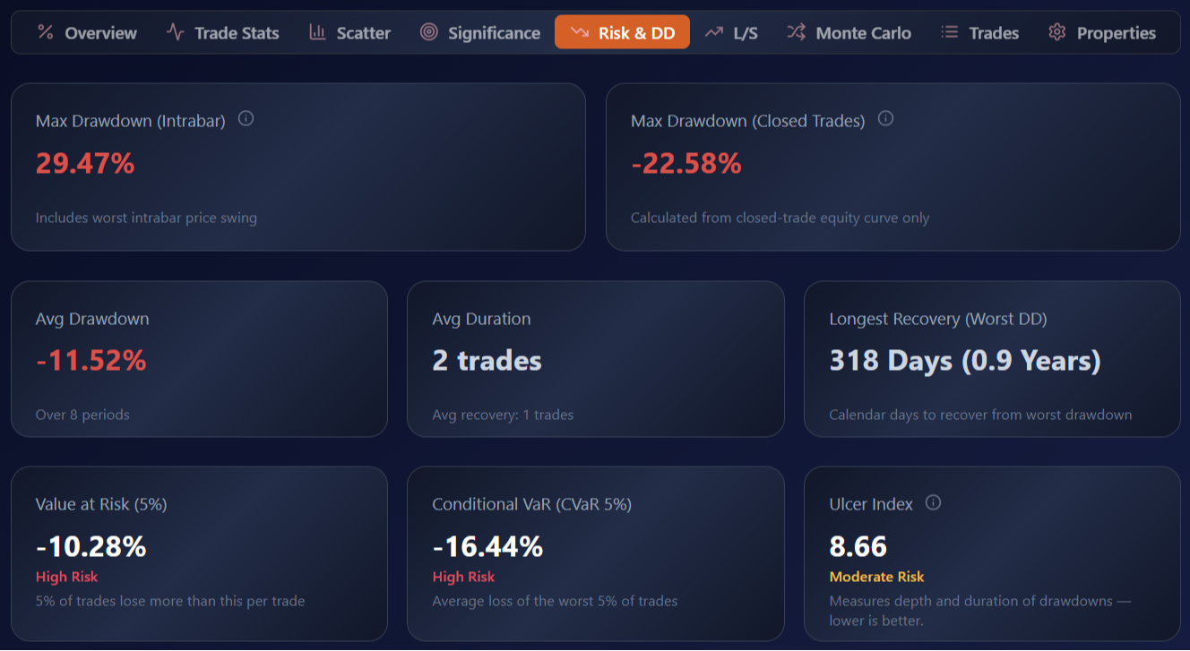 VaR, CVaR, Ulcer Index, longest recovery, avg drawdown depth, and intrabar vs. closed-trade drawdownΒ provide in-depth insights into risk.