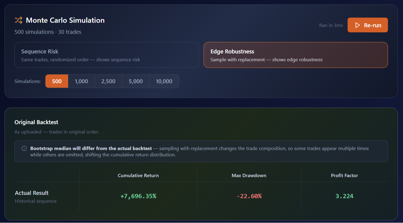 Watch as Strategy Analyzer measures statistical significance, decomposes your risk, visualizes your trade history, and stress-tests your results across thousands of simulated scenarios β so you can be sure your edge is built on skill.