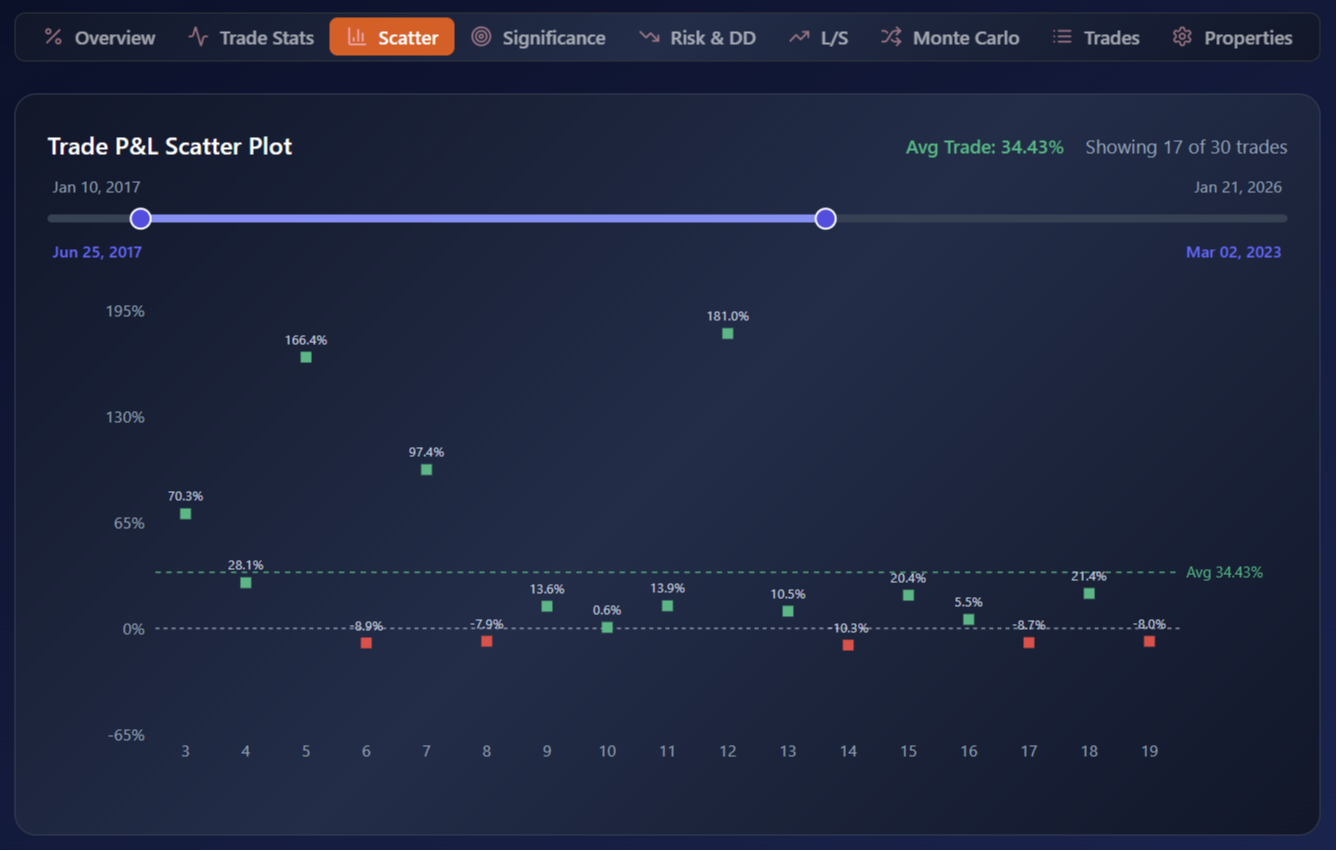 Quickly visualize any strategy's trade history through user-defined date windows. Average trade recalculates as date window adjusts.